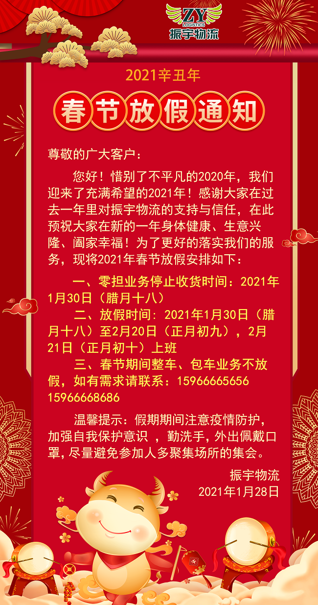 您好!惜別了不平凡的2020年,我們迎來(lái)了充滿希望的2021年!感謝大家在過(guò)去一年里對(duì)振宇物流的支持與信任,在此預(yù)祝大家在新的一年身體健康、生意興隆、闔家幸福!為了更好的落實(shí)我們的服務(wù),現(xiàn)將2021年春節(jié)放假安排如下: