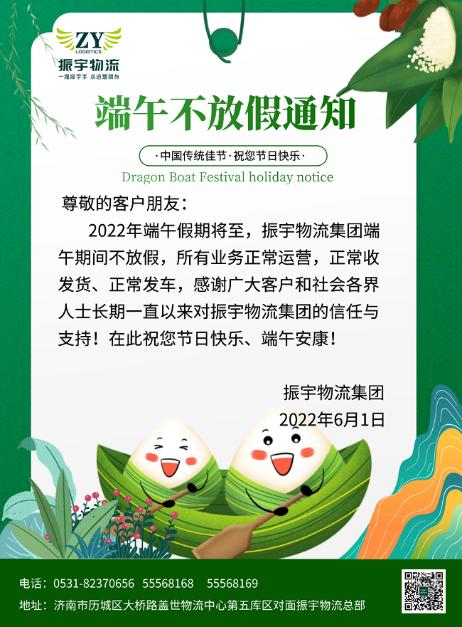 2022年端午假期將至,振宇物流集團端午期間不放假,所有業(yè)務正常運營,正常收發(fā)貨、正常發(fā)車,感謝廣大客戶和社會各界人士長期一直以來對振宇物流集團的信任與支持!在此祝您節(jié)日快樂、端午安康!