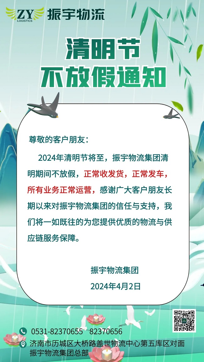 2024年清明節(jié)將至,振宇物流集團清明期間不放假,正常收發(fā)貨,正常發(fā)車,所有業(yè)務(wù)正常運營,感謝廣大客戶朋友長期以來對振宇物流集團的信任與支持,我們將一如既往的為您提供優(yōu)質(zhì)的物流與供應(yīng)鏈服務(wù)保障。