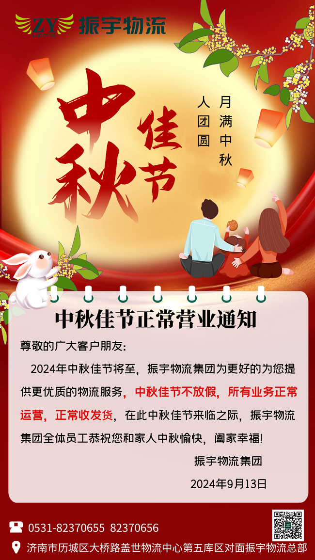 2024年中秋佳節(jié)將至,振宇物流集團為更好的為您提供更優(yōu)質(zhì)的物流服務,中秋佳節(jié)不放假,所有業(yè)務正常運營,正常收發(fā)貨,在此中秋佳節(jié)來臨之際,振宇物流集團全體員工恭祝您和家人中秋愉快,闔家幸福!