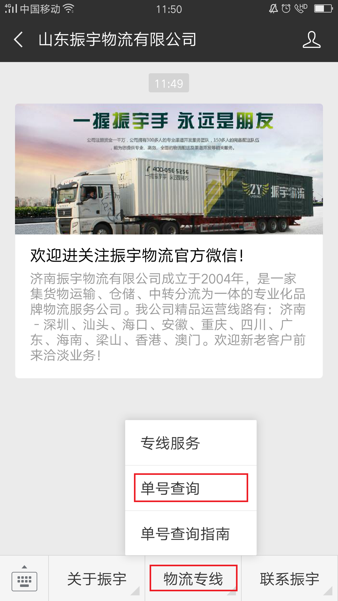 2.關(guān)注山東振宇物流有限公司公眾號。
