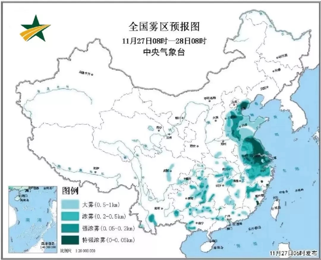 中央氣象臺11月27日06時繼續(xù)發(fā)布大霧橙色預警,27日早晨至28日早晨,華北中東部、黃淮東部和南部、江淮、江漢平原的部分地區(qū)將有大霧,其中河北東部、山東西南部、安徽東部、江蘇、上海、浙江北部等地有濃霧或強濃霧,局地有能見度不足50米的特強濃霧。預計華東地區(qū)的大霧天氣會一直持續(xù)到12月2日,長達一周。