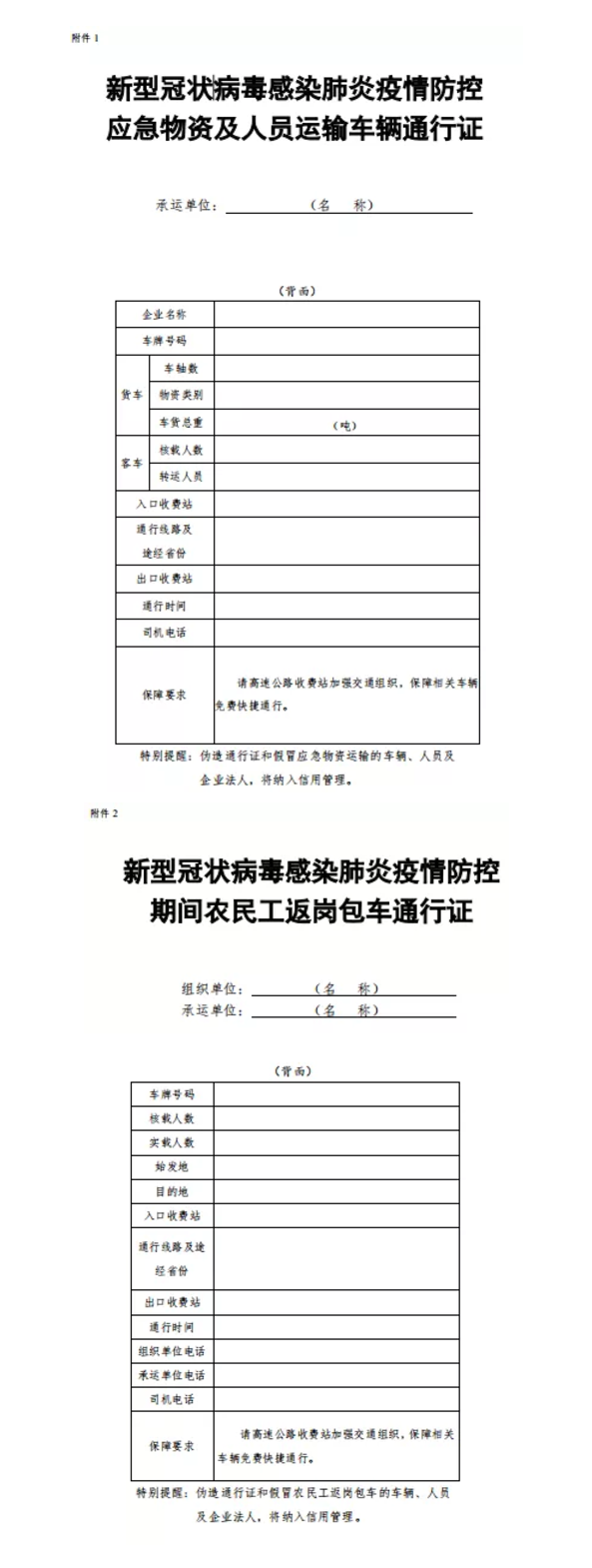 通知要求,地方各級(jí)交通運(yùn)輸部門(mén)要認(rèn)真落實(shí)《交通運(yùn)輸部關(guān)于切實(shí)保障疫情防控應(yīng)急物資運(yùn)輸車(chē)輛順暢通行的緊急通知》和《交通運(yùn)輸部關(guān)于疫情防控期間免收農(nóng)民工返崗包車(chē)公路通行費(fèi)的通知》要求,切實(shí)簡(jiǎn)化“新型冠狀病毒感染肺炎疫情防控應(yīng)急物資及人員運(yùn)輸車(chē)輛通行證”(簡(jiǎn)稱(chēng)“車(chē)輛通行證”)、“新型冠狀病毒感染肺炎疫情防控期間農(nóng)民工返崗包車(chē)通行證”(簡(jiǎn)稱(chēng)“包車(chē)通行證”)辦理流程,通過(guò)政府網(wǎng)站、微信、電子郵件等便捷方式提供“車(chē)輛通行證”“包車(chē)通行證”統(tǒng)一式樣,供承運(yùn)單位或駕駛?cè)嗽诒镜刈孕写蛴?、自行填?xiě)。
