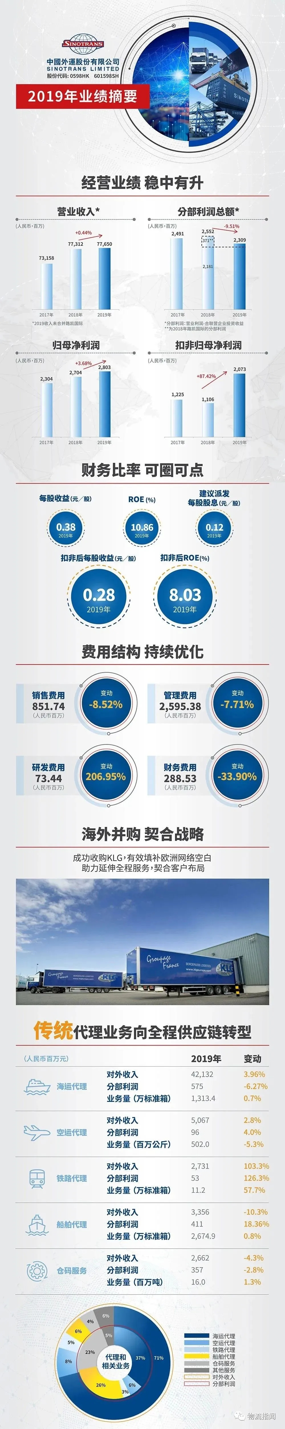 據(jù)悉,2019年,中國(guó)外運(yùn)實(shí)現(xiàn)營(yíng)業(yè)收入776.50億元,同比增長(zhǎng)0.44%(可比口徑下實(shí)現(xiàn)增長(zhǎng)2.4%);分部利潤(rùn)實(shí)現(xiàn)23.09億,可比口徑下實(shí)現(xiàn)增長(zhǎng)5.9%。實(shí)現(xiàn)歸母凈利潤(rùn)28.03億元,同比增長(zhǎng)3.68% ;實(shí)現(xiàn)扣非后的歸母凈利潤(rùn)20.73億元,同比增長(zhǎng)87.42%。每股收益為0.38元人民幣。扣非后的ROE增長(zhǎng)了3.08個(gè)百分點(diǎn)。