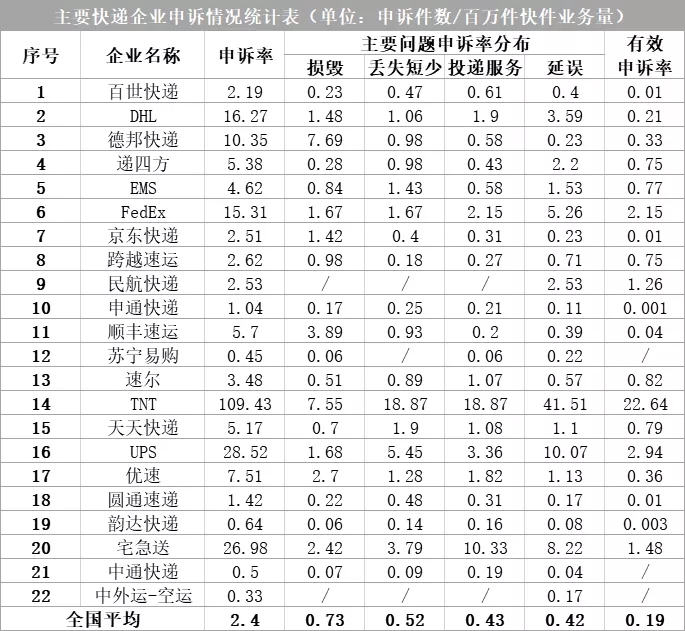 全國(guó)快遞企業(yè)申訴率(百萬(wàn)件快件業(yè)務(wù)量)平均為2.40,有效申訴率平均為0.19。用戶(hù)對(duì)快遞企業(yè)申訴主要問(wèn)題中,快件損毀申訴率平均為0.73,快件丟失短少申訴率平均為0.52,投遞服務(wù)申訴率平均為0.43,快件延誤申訴率平均為0.42。