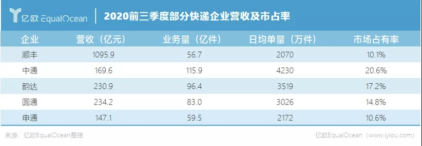 億歐EqualOcean從國家郵政局獲悉,2020年中通、韻達、圓通、申通、順豐所占市場份額分別為20.4%、17.02%、15.18%、10.58%和9.8%。與2020年前三季度相比數(shù)據(jù)波動不明顯,各家市場表現(xiàn)平分秋色。