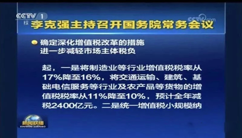 會議指出,過去五年通過實施營改增累計減稅2.1萬億元。按照黨中央、國務(wù)院部署,為進一步完善稅制,支持制造業(yè)、小微企業(yè)等實體經(jīng)濟發(fā)展,持續(xù)為市場主體減負,會議決定,從2018年5月1日起,一是將制造業(yè)等行業(yè)增值稅稅率從17%降至16%,將交通運輸、建筑、基礎(chǔ)電信服務(wù)等行業(yè)及農(nóng)產(chǎn)品等貨物的增值稅稅率從11%降至10%,預(yù)計全年可減稅2400億元。