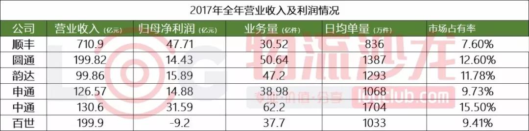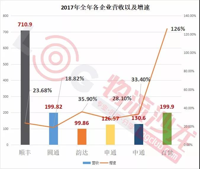 我們可以從營(yíng)收增速來(lái)看看各家企業(yè)表現(xiàn)力。具體來(lái)看,百世第一,增幅高達(dá)126%,其次是韻達(dá)、中通、申通,分別是35.9%、33.4%、28.1%,都高于郵政局公布的2017年全年快遞收入增長(zhǎng)速度(2017年行業(yè)增速為24.7%)。