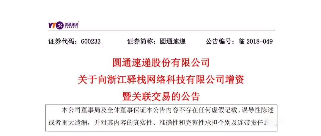 根據(jù)公告,圓通擬以自有資金4.5億元人民幣對浙江驛棧進(jìn)行增資,其中1575萬元人民幣認(rèn)繳新增注冊資本,4.3425億元人民幣計入資本公積金。本次投資后,公司將持有浙江驛棧1575萬元人民幣注冊資本,持股占增資完成后比例為6.28%。
