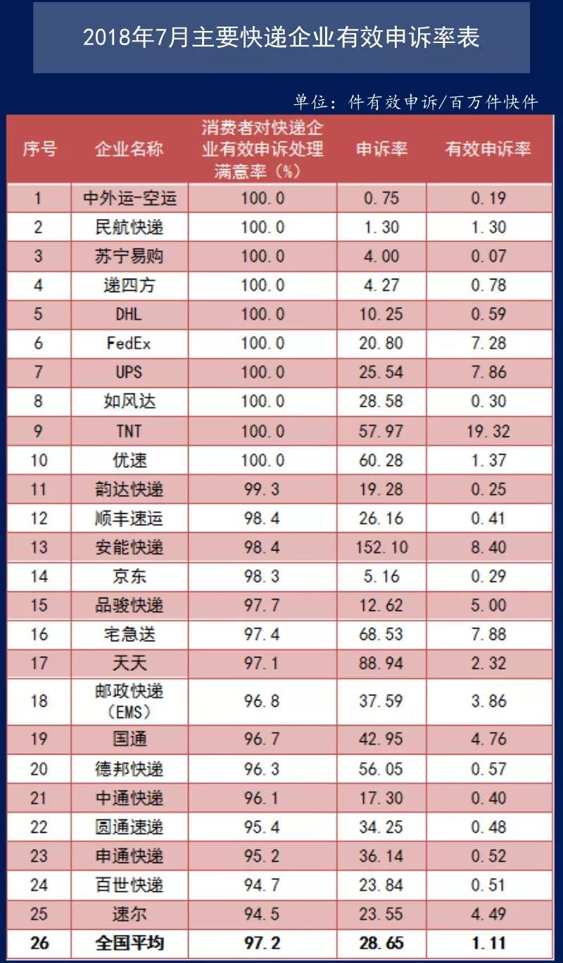 7月,消費(fèi)者對(duì)快遞企業(yè)有效申訴處理滿意率(消費(fèi)者對(duì)快遞企業(yè)有效申訴處理滿意件數(shù)與快遞企業(yè)有效申訴總量之比)為97.2%,低于全國(guó)平均有效申訴處理滿意率的快遞企業(yè)有9家。