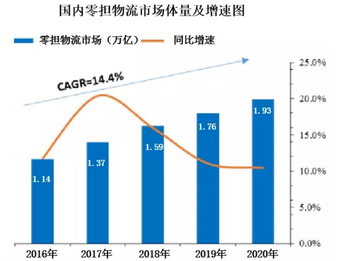專家預(yù)測(cè),到2020年,零擔(dān)物流(即專線物流)行業(yè)市場(chǎng)體量將達(dá)到近2萬億元。從2016年開始,整個(gè)市場(chǎng)都在以10%以上的速度在增長(zhǎng),發(fā)展前景十分廣闊。